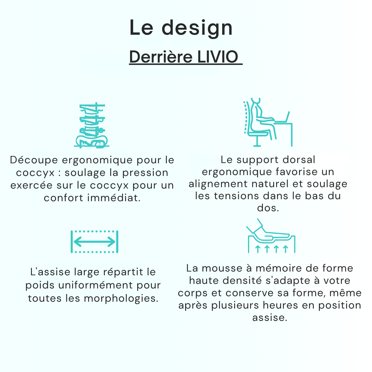 LIVIO aide à réduire la pression exercée sur le coccyx, le bas du dos, les hanches et le nerf sciatique, en soutenant la colonne vertébrale et en améliorant l’alignement postural, contrairement aux coussins classiques qui ne font que rembourrer.